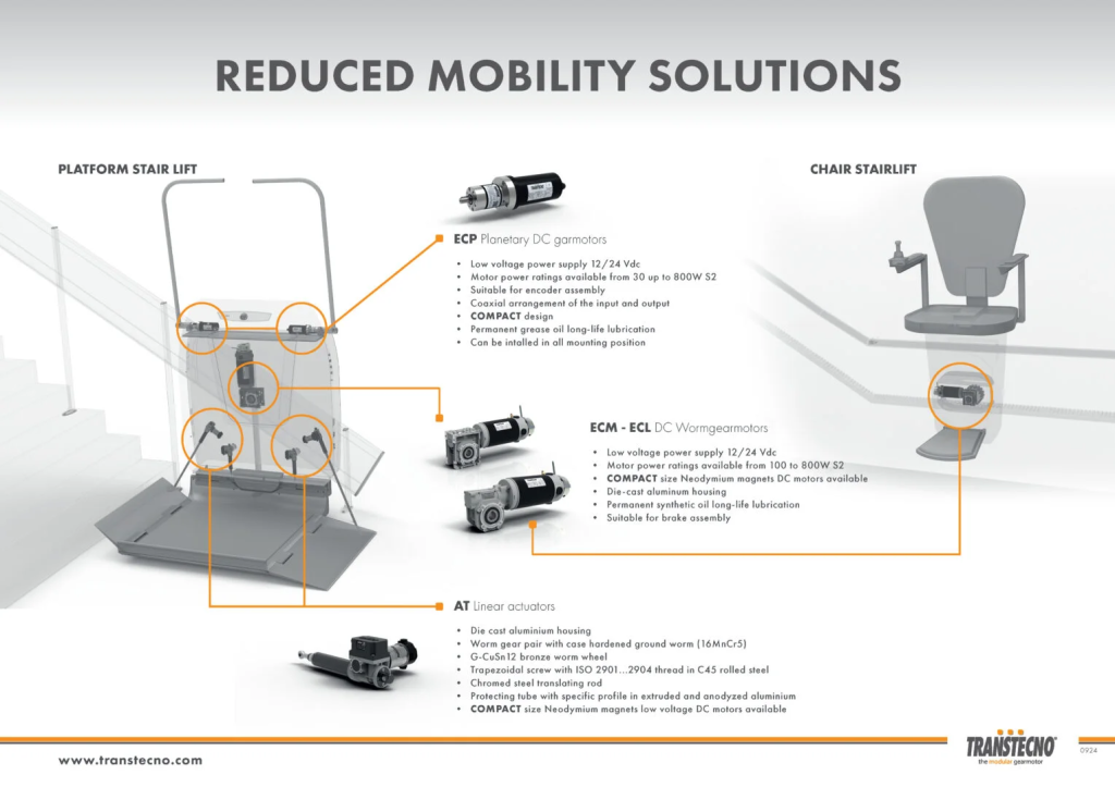 Los motorreductores y actuadores lineales son componentes fundamentales en los sistemas de elevación para personas con movilidad reducida, como plataformas y salvaescaleras. Estos dispositivos transforman la energía eléctrica en movimiento mecánico, para garantizar su fiabilidad y seguridad durante el funcionamiento.